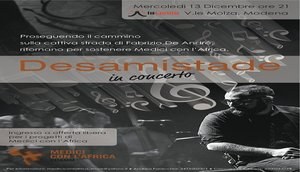 I DeSamistade tornano alla celeberrima Tenda di Modena con tutto il carico di musica e poesia raccolto sulla Cattiva Strada di Fabrizio De André. Evento imperdibile per gli amanti di Faber, per i cultori della poesia cantautorale e per i fieri sostenitori della musica dal vivo di qualità. Nella volontà di spendersi in eventi selettivi e a favore della cittadinanza attiva e solidale, il ricavato della serata (ingresso ad offerta libera) sarà devoluto ai progetti umanitari di CUAMM - Medici con L'Africa.