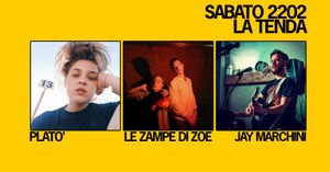 Da Martina Platone, in arte PLATÓ, a Jay Marchini passando per Le Zampe di Zoe, questo il programma di sabato 22 Febbraio alla Tenda, in una serata che mescola artisti alla prima apparizione in Tenda con vecchie conoscenze che più di una volta sono salite sul nostro palco.