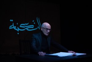 L’interpretazione di Franco Mazzi è accompagnata dalle musiche del Trio Joubran, il più celebre ensemble palestinese, mentre alle spalle dell’attore compaiono le parole arabe nella loro più suggestiva dimensione calligrafica, alternata a immagini che richiamano la tragedia.