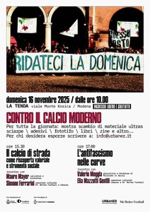 Giornata interamente dedicata al tema "Contro il calcio moderno". Per tutta la giornata ci saranno mostre e scambi di materiali ultras (sciarpe, adesivi, fototifo, libri e molto altro).